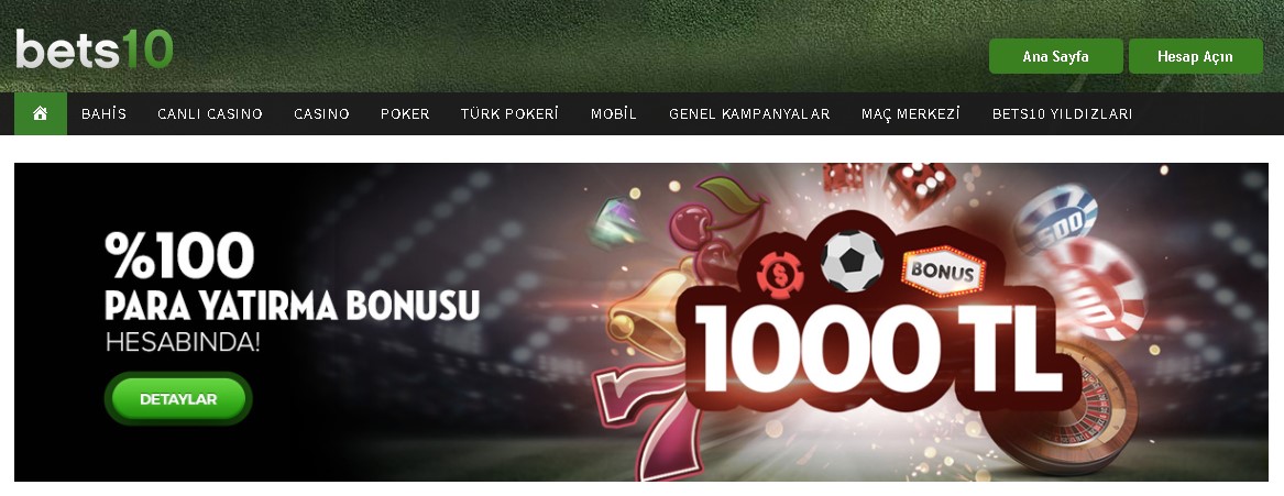 Bets10 1000 TL %100 para yatırma bonusu sunarak kullanıcılarının sitede daha avantajlı bir şekilde bahis kuponlarını hazırlamasına yardımcı olmaktadır. Ülkemizde en geniş bahis yelpazesine sahip olan ve kullanıcılarına zengin bir dünyanın kapılarını aralayan site olan Bets10, bonusları ile de hizmetlerini taçlandırıyor. İnternet üzerinde çok fazla bahis sitesi hizmet verdiğinden dolayı kullanıcılar da sitelere üye olurken zengin bonus seçenekleri ve güvenilirlikleri dikkate alarak siteler üzerinden üyeliklerini alıyor.
